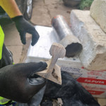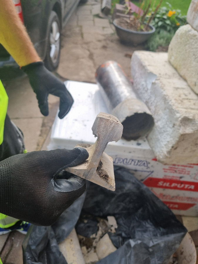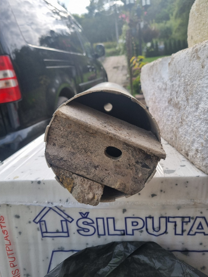 Antroji skylė pateikė netikėtą siurprizą – gręžiant sienoje pasitaikė lango sija ir mažojo fagonų bėgis iš labai storo metalo. Jau galvojau, kad teks ieškoti kitos vietos, o esamą skylę užtaisyti, nes grąžtas buvo įsigilinęs apie 35 cm. Tačiau Tomas mane nuramino, atsinešė kitą grąžtą ir be problemų pragręžė net storiausią metalą.